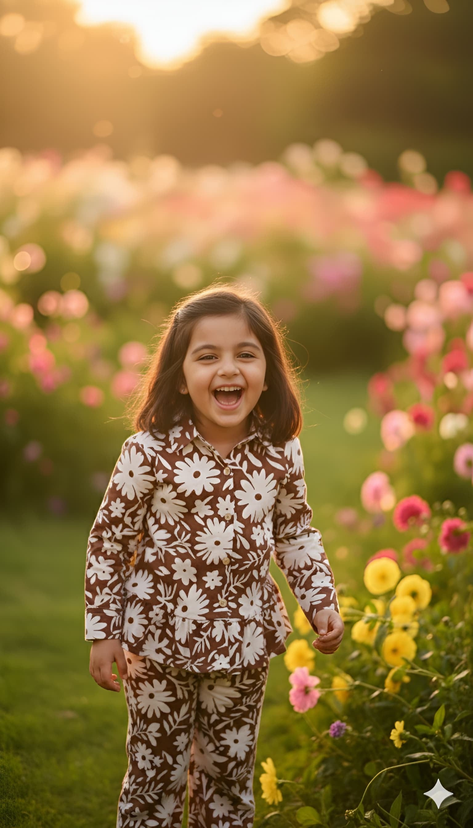 Brown Floral Print Night Co-ord Set For Girls With Frills
