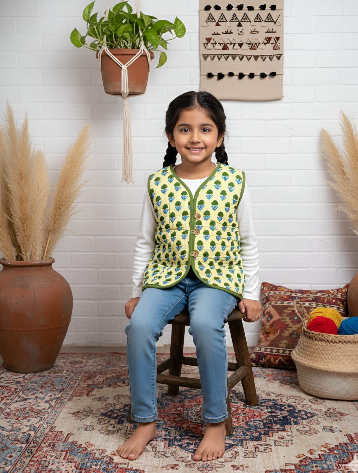 Reversible Sleeveless Cotton Printed Quilted Jacket for Kids | Green